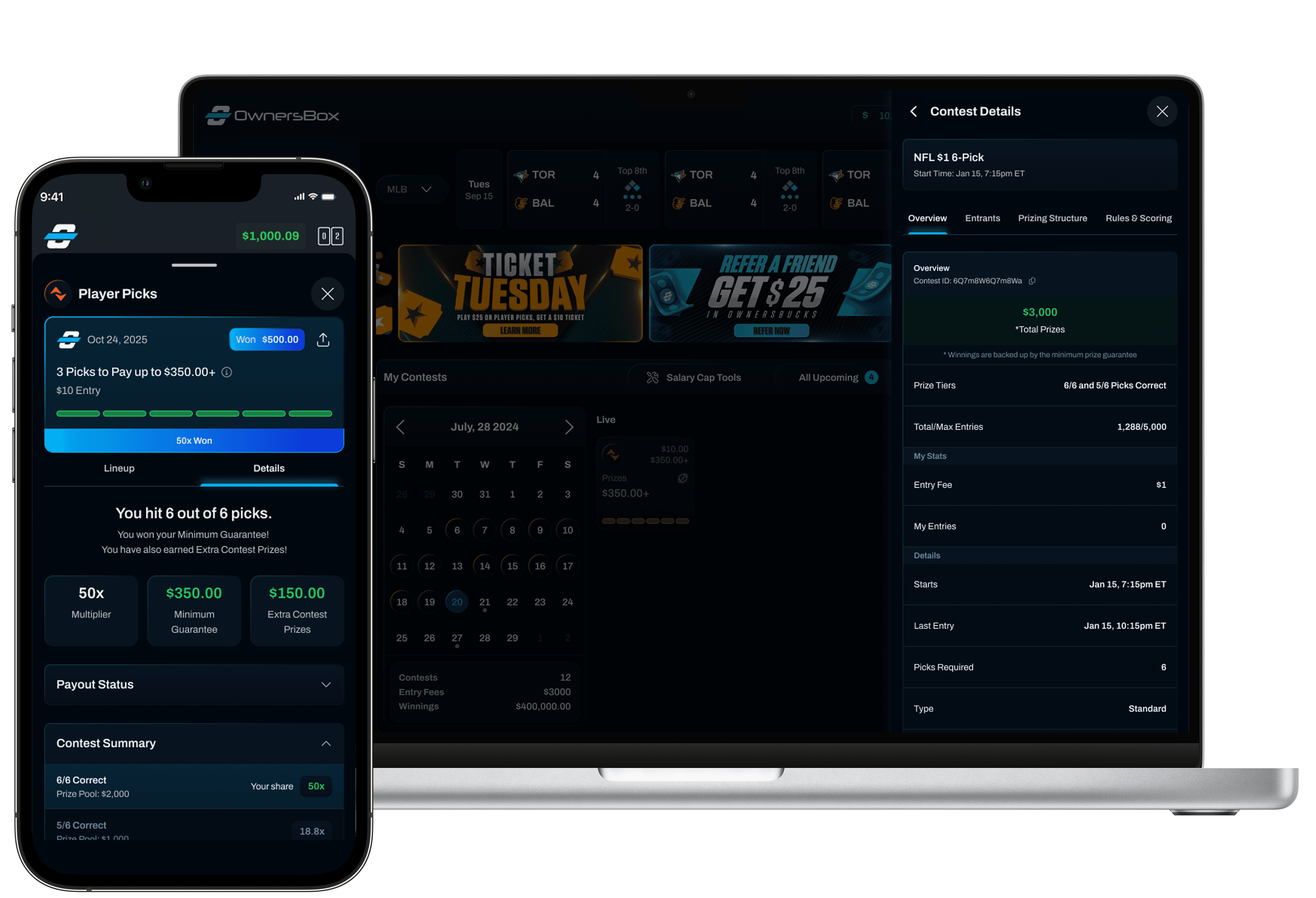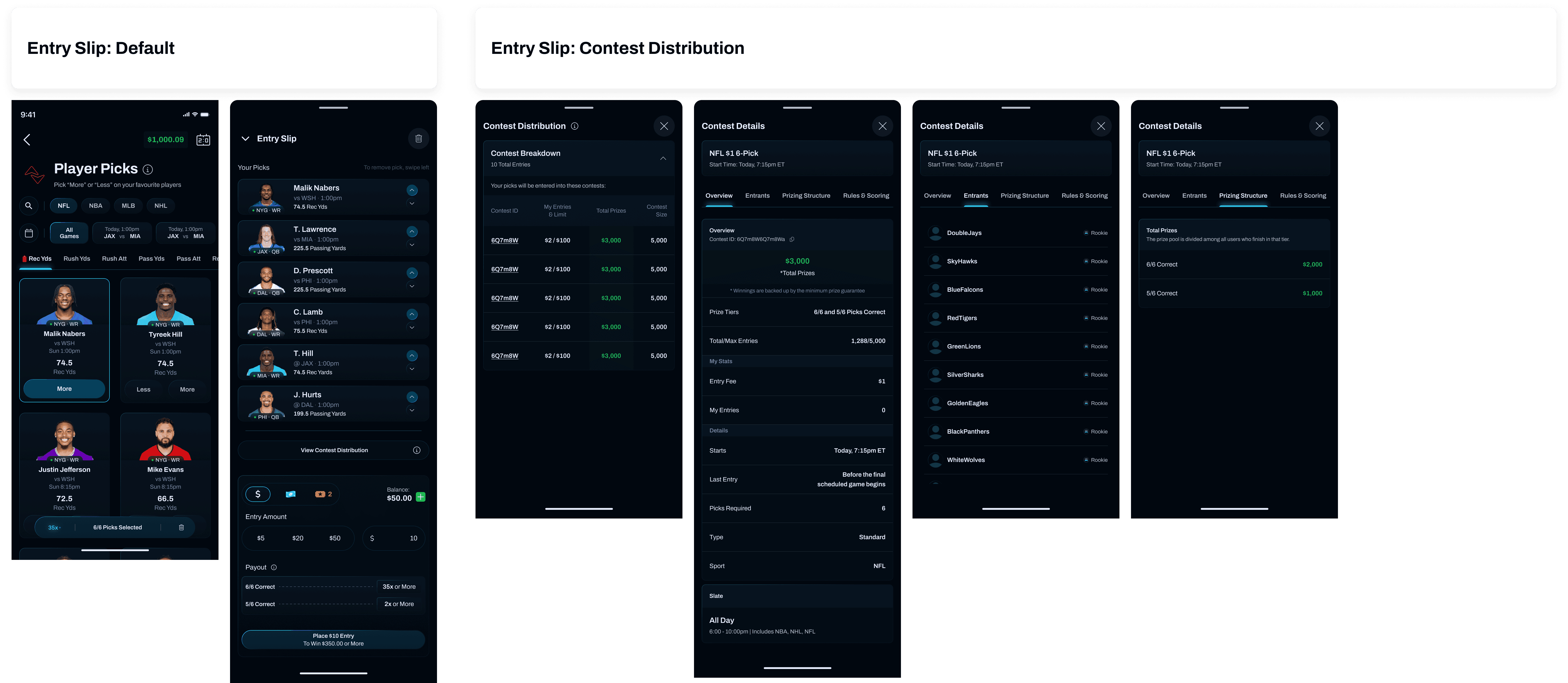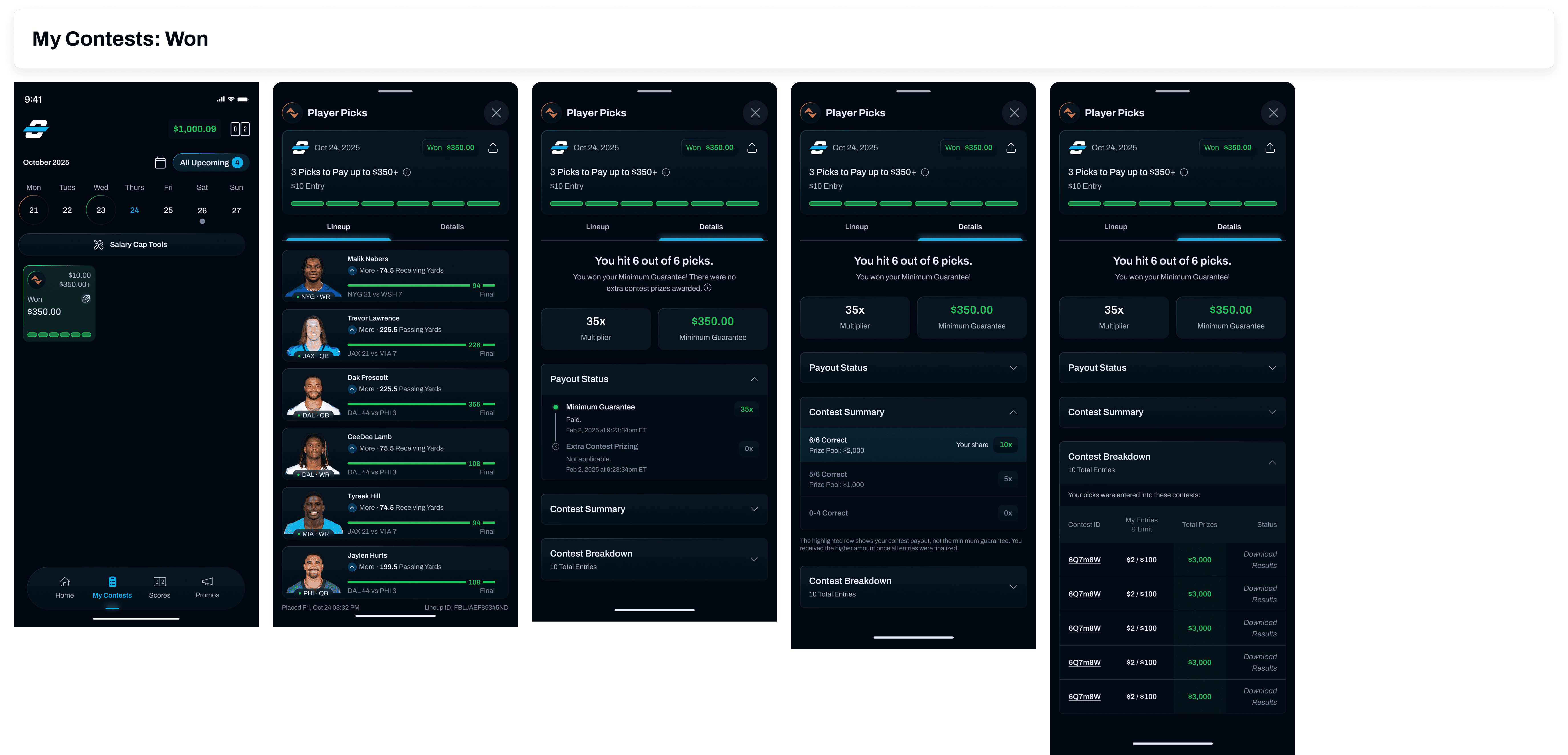 These screens capture the final direction for the prize pool model, showing key journeys from making the picks to tracking the contest live.