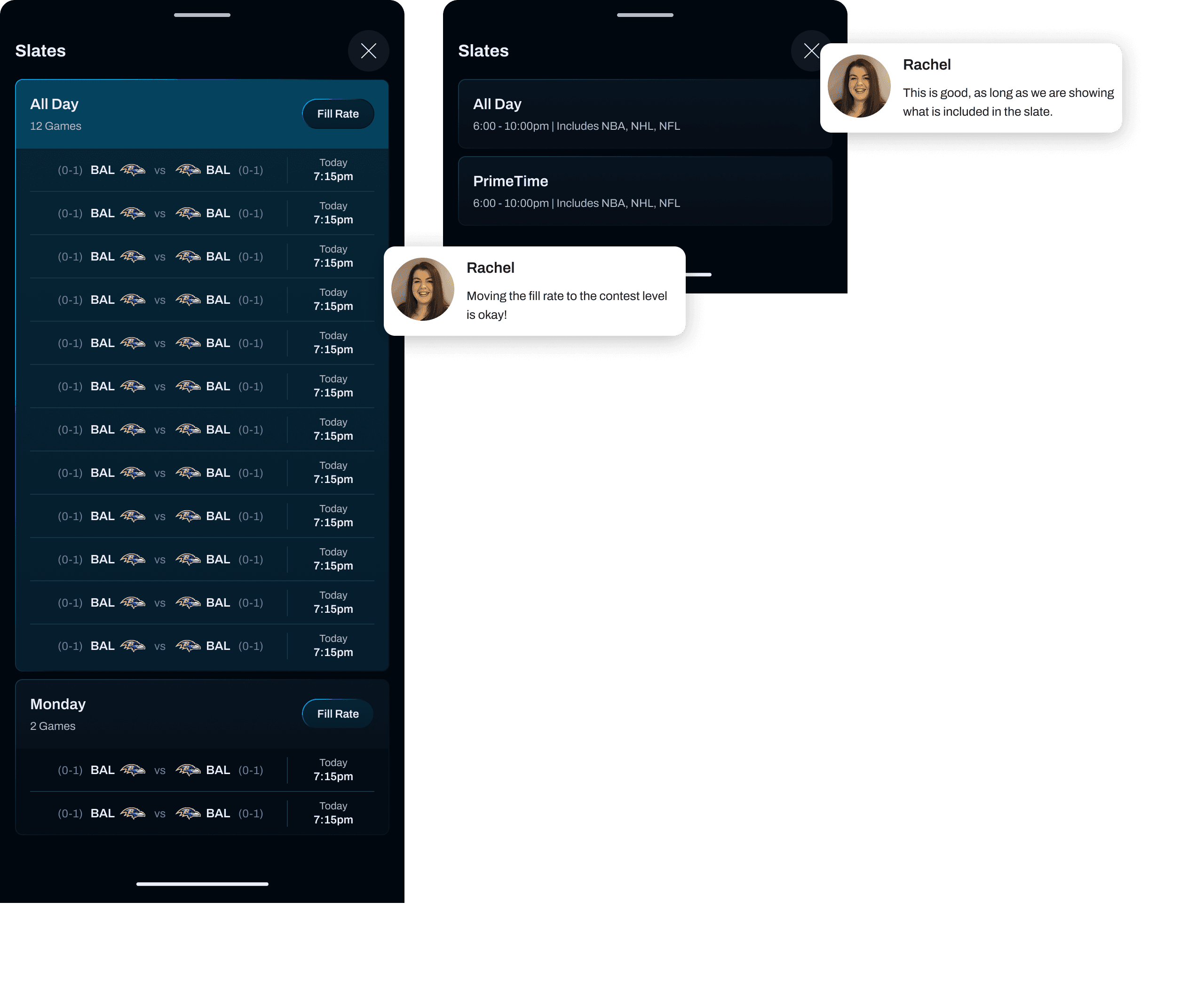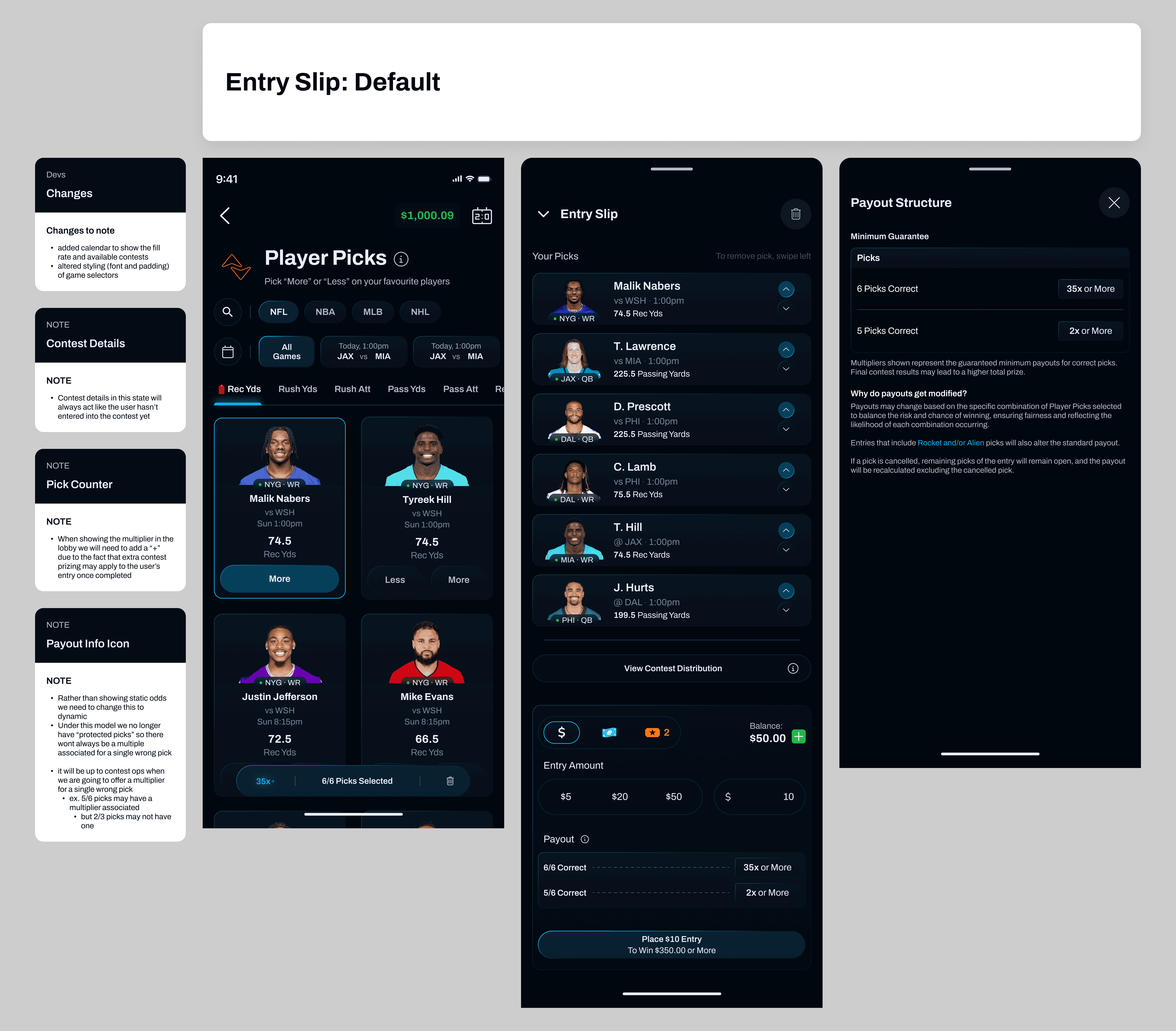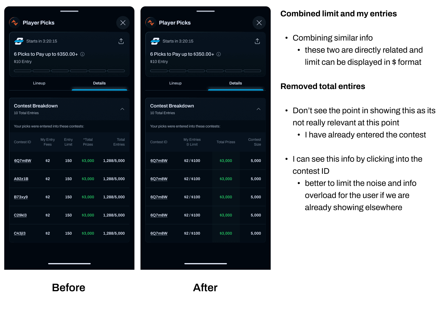 One key learning emerged during internal testing: users preferred a less intrusive experience. Competitors were trending toward simpler interfaces, and our own flows validated that approach. I iterated by stripping back unnecessary contest-level data (i.e. fill rates, slates, and entry details) and moved some information to secondary surfaces, creating a cleaner and more approachable experience.