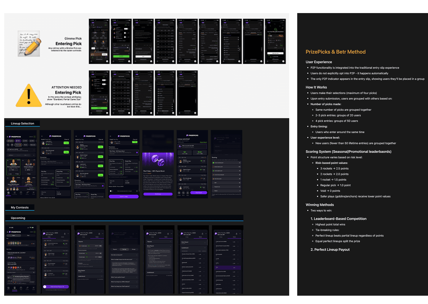 I started by exploring how existing P2P products worked. Starting by studying user help guides, compliance requirements, and real world implementations across competitors like PrizePicks and DraftKings Pick6. I reviewed rules, app experiences, and feature sets, then consolidated everything into an internal presentation to align our leadership and product teams on opportunities and risks.