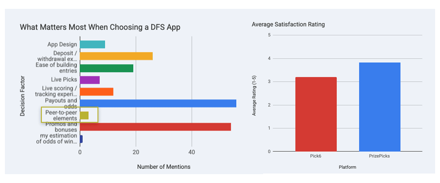 We ran a targeted survey with existing users who had played on peer-to-peer platforms in the past 3 months. Over 300 responses came in. Many users expressed positive sentiment toward PrizePicks and DraftKings Pick6, but most couldn’t identify that they were actually playing peer-to-peer games.